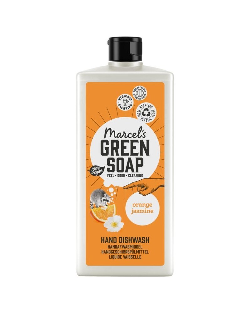 Marcel’s Green Soap afwasmiddel Sinaasappel & Jasmijn is gemaakt van plantaardige zepen, vegan, minstens 97% biologisch afbreekbaar en komt in een fles van 100% gerecycled plastic. Marcel’s Green Soap afwasmiddel is gemaakt van plantaardige zepen en dus vriendelijk voor het milieu, je huis én je lichaam. Verrijkt met essentiële olie van sinaasappel, jasmijn en zonnebloem en een heerlijk natuurlijk sinaasappel & jasmijn parfum, zodat afwassen (we durven het bijna niet te zeggen) een echte ‘geurbeleving’ wordt. En terwijl je wordt opgeslokt door die intense ervaring wordt de huid van je handen gelijk lekker verzorgd door het zachte schuim en de verrijkende ingrediënten. Het doen van de afwas was nog nooit zo ontspannen!