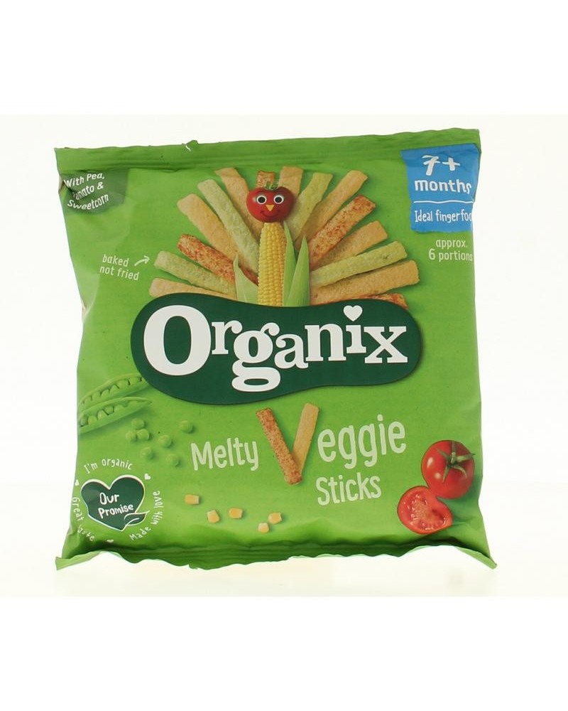Een lekkere biologische melty baby snack in een handige zak met 3 verschillende groente sticks.