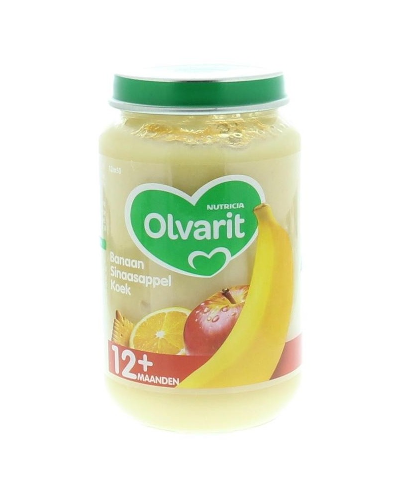 32,3% appel, 30% banaan, water, 8% sinaasappel, 5,2% boterbiscuitpoeder (TARWEbloem, boter (MELK), magere MELKpoeder, rijsmiddel (ammoniumcarbonaat), zuurteregelaar (citroenzuur)), rijstebloem, geconcentreerd citroensap, L-ascorbinezuur