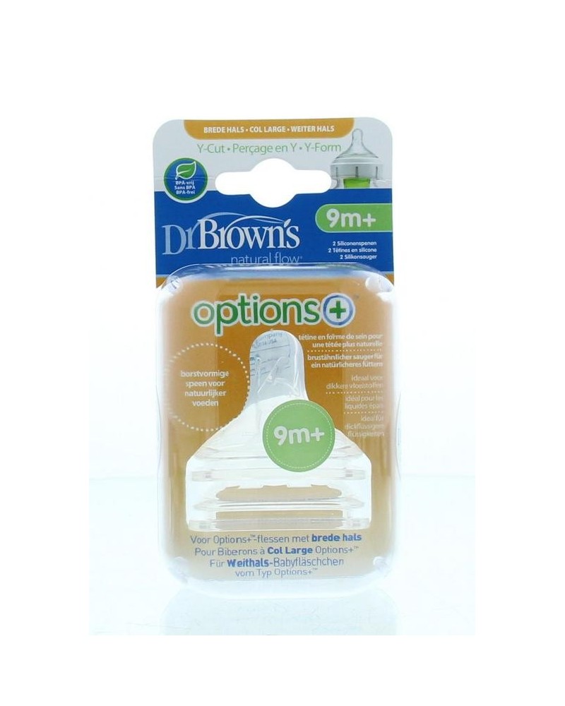 Alleen geschikt voor Dr. Brown's Options+ Anti-colic brede halsfles. Y-cut speen voor gulzig etende baby's en baby's waarvoor de voorgaande fasen niet 'snel' genoeg gaan - ook geschikt voor dikkere vloeistoffen - vanaf 9 maanden. LET OP: In tegenstelling tot de andere spenen van Dr. Brown's is de Y-cut speen niet gegoten, waardoor er een mogelijk risico is voor inscheuren. Mogelijk dat je deze speen eerder moet vervangen dan een gewone speen. Dit komt o.a voor bij het gebruik van vezelrijke pap (bijv. johannes broodpitmeel). Deze innovatieve borstvormige speen vergemakkelijkt de overgang van borst naar fles en vice versa. Op deze manier wordt voeden een plezierige ervaring, zowel voor jou als voor je kindje. De zachte siliconen speen is speciaal ontworpen om eenzelfde gelijkmatige natuurlijke doorstroming te bieden als bij borstvoeding. De spenen van Dr. Brown’s zijn gemaakt van klinisch geteste siliconen. Door de zeer zachte textuur en speciale vorm liggen ze perfect in je baby’s mond.Vervang spenen elke zes weken, of eerder als ze tekenen van slijtage vertonen. Per 2 stuks verpakt.