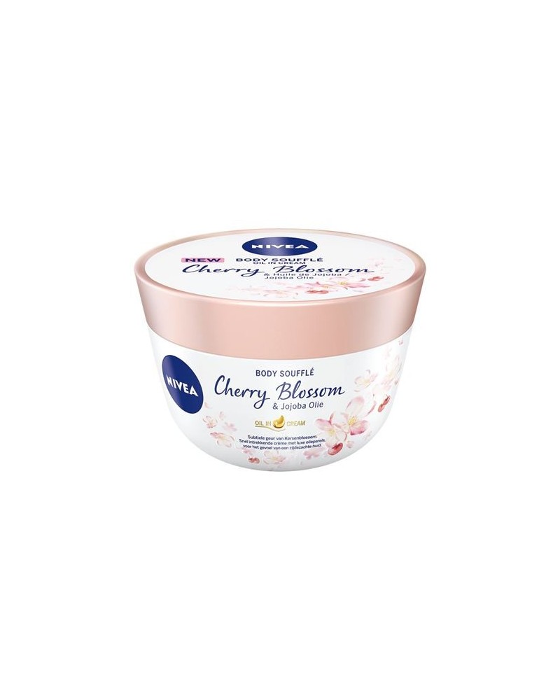 De nieuwe NIVEA Body Soufflés bevatten luxe olieparels, die de huid zijdezacht laten aanvoelen. Deze snel-intrekkende body crème plakt niet en heeft een subtiele geur van Kersenbloesem. De Jojoba Olie voedt de huid, maar laat geen plakkerig laagje achter.