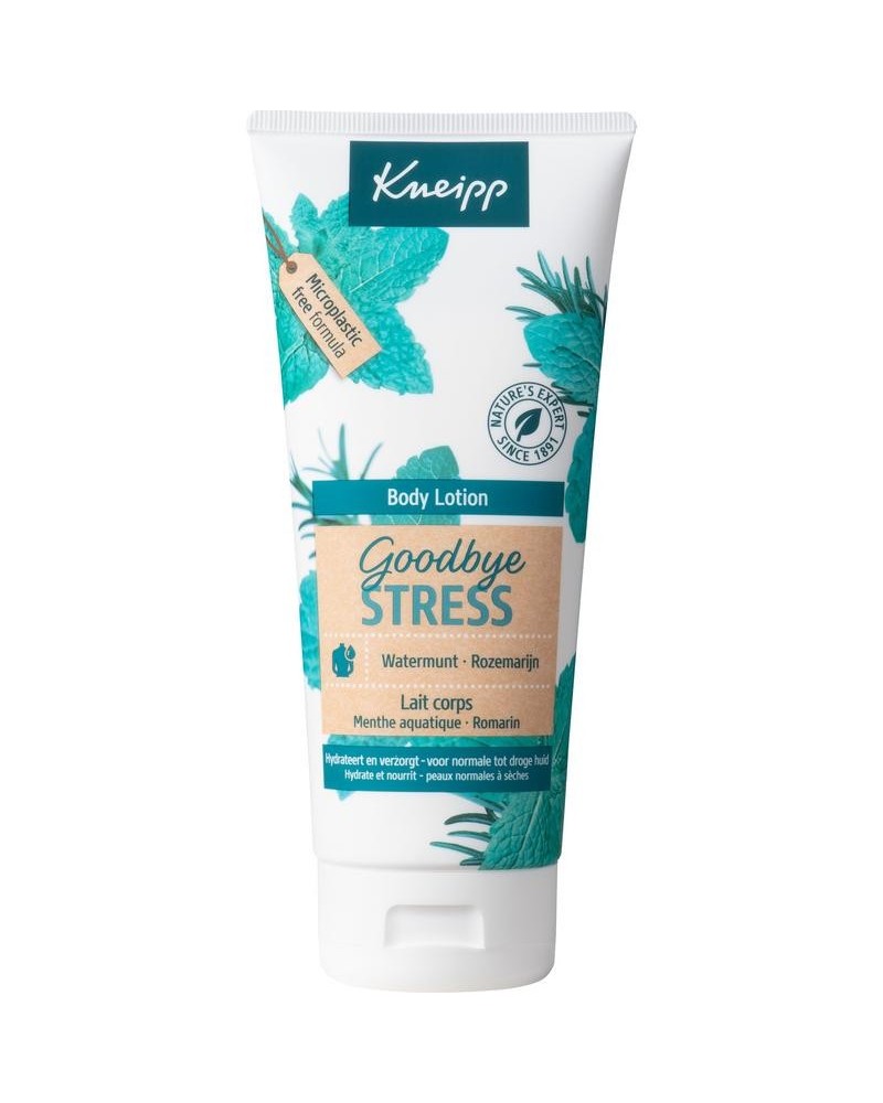 Kneipp® body lotion Goodbye Stress is een natuurlijke body lotion die gemakkelijk wordt opgenomen door de huid met een verfrissende geur. Een verkwikkend en verfrissend verwenmoment voor jezelf en je huid. De zachte verfrissende geur van watermunt en rozemarijn zorgt voor een hoger energieniveau. De verzorgende natuurlijke ingrediënten dragen bij aan het herstel en de bescherming van de droge huid. Voor de Goodbye Stress producten selecteerde en combineerde Kneipp de meest effectieve natuurlijke oliën voor een optimaal opwekkend effect. Hello positive energy!