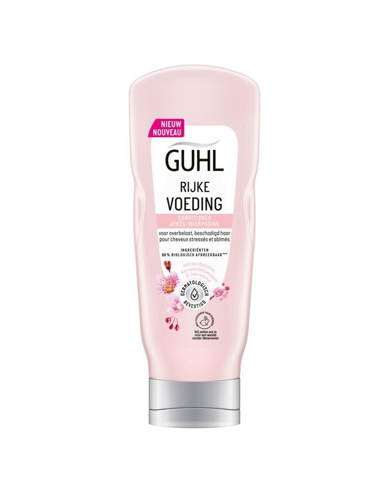 Guhl Rijke Voeding conditioner, voor overbelast, breekbaar en beschadigd haar, herstelt en versterkt doelgericht de haarvezels voor verbeterde veerkracht. De volledige herstelformule beschermt het haar en geeft 93% meer weerstand*. Geeft het haar zijdezachte souplesse en gemakkelijke doorkambaarheid zonder het haar te verzwaren.