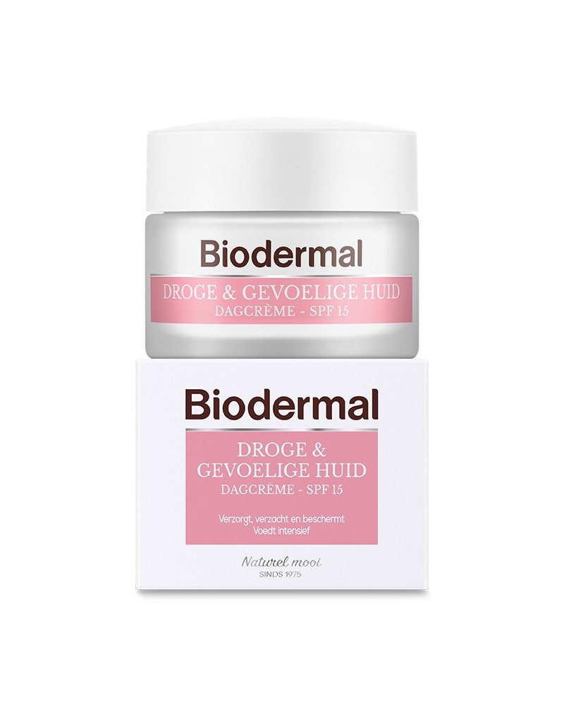 Droge & gevoelige huid dagcrème van Biodermal is speciaal ontwikkeld om de huid op een intense, maar milde wijze te voeden, verzachten en te beschermen. De droge & gevoelige huid heeft een verstoorde huidbarrière (bijvoorbeeld door een tekort aan vetten). Hierdoor reageert de huid sneller en kan dan trekkerig en gevoelig aanvoelen. De rijke crème trekt direct in en laat de huid soepel en zacht aanvoelen. De formule is met zorg samengesteld en bevat voornamelijk milde bestanddelen. Bevat SPF 15: beschermt tegen UVA- en UVB-straling.
