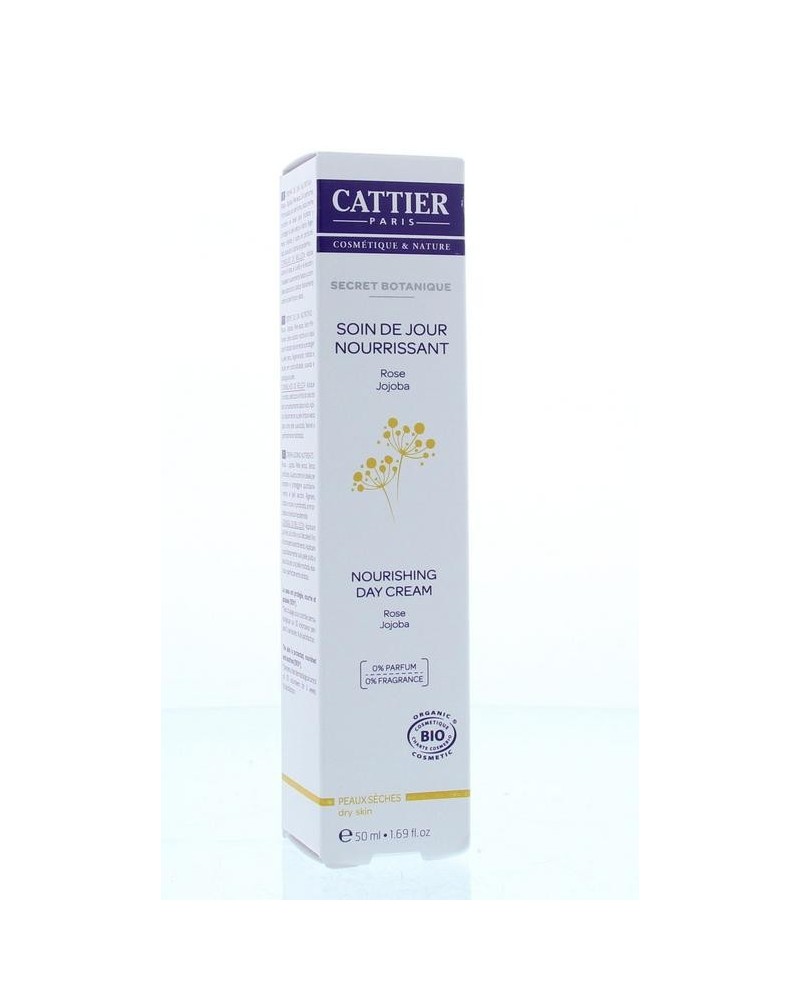 De biologische, parfumvrije en voedende dagverzorging Secret Botanique van Cattier is ideaal om droge en gevoelige huidtypes elke dag te voeden en te hydrateren. De crème combineert biologische jojobaolie (een product dat de huid beschermt en de huidbalans herstelt) met biologisch zonnebloemextract voor een antioxiderende, voedende en verzachtende werking. Daarnaast bevat de crème fosfolipiden die de huid actief hydrateren en regenereren, de huidbarrière versterken en de hele dag lang optimaal inspelen op de hydratatiebehoefte van de opperhuid. De biologische rozen zijn een echt schoonheidswondermiddel dat de huid verkwikt, verfrist en kalmeert.