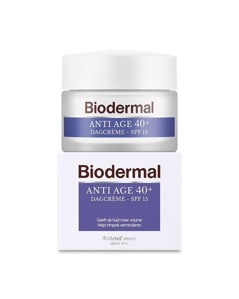 Rond het 40e levensjaar verliest de huid haar elasticiteit en veerkracht en ontstaan er rimpels. Anti Age 40+ dagcrème van Biodermal helpt fijne lijntjes en rimpels te verminderen. Daarnaast verstevigt de crème de verslapte huid van gezicht en hals intensief. De huid krijgt meer volume, heeft een zichtbaar verstevigend effect en egaliseert bestaande rimpels. Dit resulteert in een huid die niet alleen mooier oogt maar ook strakker en gladder aanvoelt. Bevat SPF 15: beschermt tegen UVA- en UVB-straling.