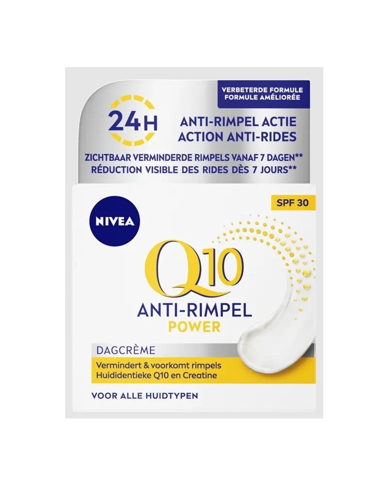 Nivea Q10 Power Anti-Rimpel + Verstevigende Dagcrème bevat Q10 die 100% identiek is aan die van je huid. Daarom werkt deze pure en natuurlijke kwaliteit van Q10 perfect samen met uw huid. De dagverzorging met SPF 30 voorkomt de vorming van rimpels door de zon en beschermt je huid tegen UVA- en UVB-stralen die vroegtijdige huidveroudering veroorzaken. De huidverdraagzaamheid van deze dagverzorging voor de normale huid is dermatologisch goedgekeurd.