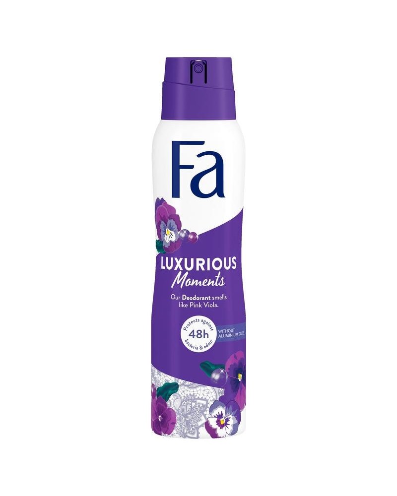Ontdek Fa Luxurious Moments deodorant spray met de geur van roze viooltjes. De vegan formule biedt 48 uur bescherming tegen nare geurtjes en is vrij van aluminiumzouten.