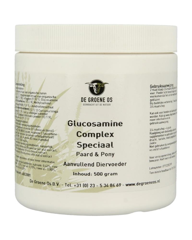 Tricalciumcitraat van organische zuren (11.1.11), Trimagnesiumcitraat van organische zuren (11.2.10), collageen (9.10.1), Glucsoamine (uit SCHAALDIEREN) (13.2.8), Methylsulfonylmethaan (MSM) (13.9.1), Chondroitinesulfaat (uit runderkraakbeen) (13.12.2), Curcuma longa poeder (13.1.9), Yugga schidigera poeder (13.1.9), Zingiber officinalis poeder (13.1.9), Hyaluronzuur (13.12.1), (Pro)Vitaminen: Vitamine D3 (cholecalciferol) (3a672) 165.000 IE/gram, Vitamine C (ascorbinezuur) (als natriumcalciumascorbylpalmitaat) (3a312) 95.348, Vitamine B3 (niacinamide) (3a315) 11.286 mg/kg, Natuurlijk botanisch: wierook (boswellia serrata) extract, Grote brandnetel (urtica dioica) extract, Rozemarijn (rosmarinus officinalis) extract.
