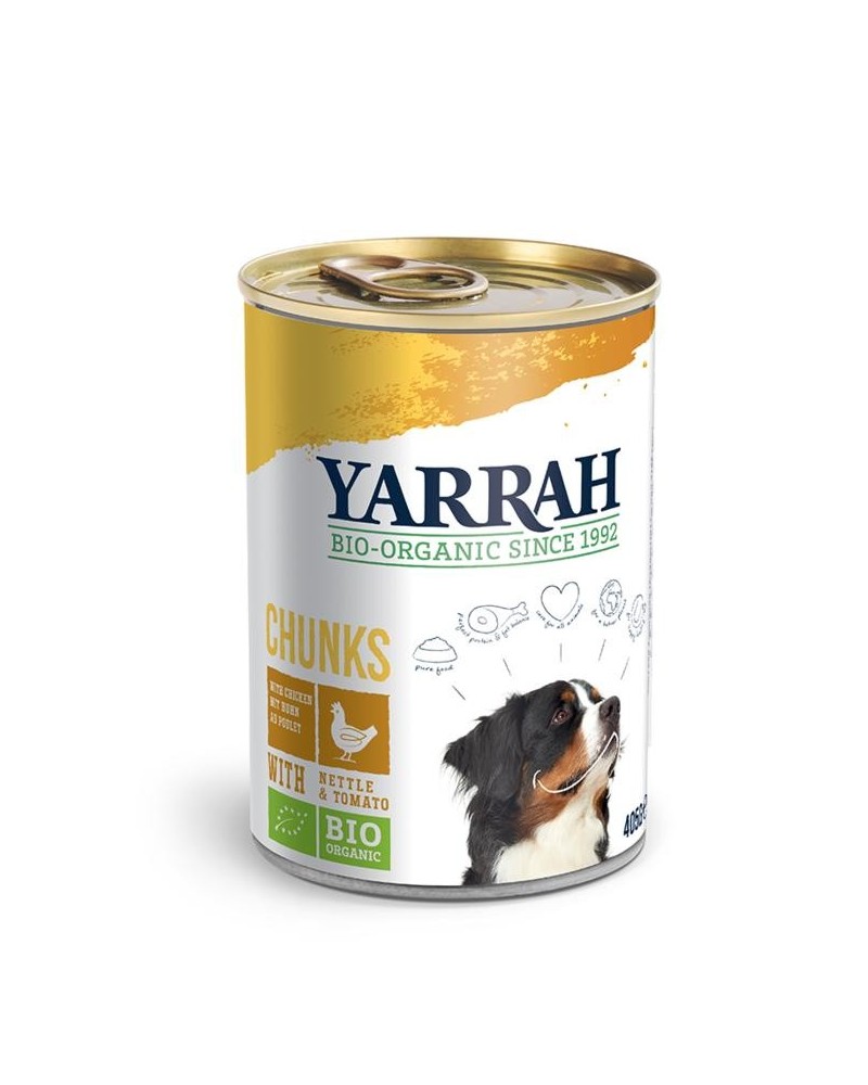 Smakelijke chunks met biologische kip, aangevuld met biologisch gecertificeerde brandnetel en tomaat. Het biologische natvoer vormt een complete, voedzame en zeer smakelijke maaltijd voor je hond. Zuiver biologisch voer en dus zonder toegevoegde chemische geur-, kleur- en smaakstoffen, pesticiden en GMO, waarbij de best opneembare eiwitten zijn geselecteerd. Zo krijgt je hond precies binnen wat hij nodig heeft.