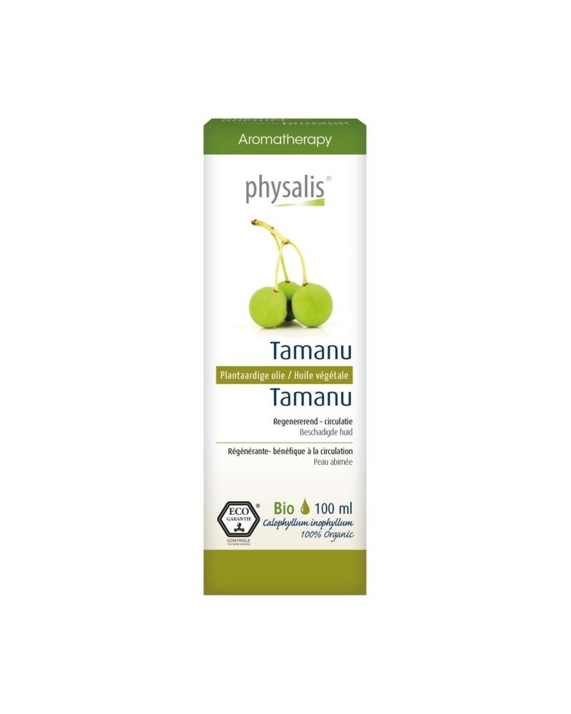 Physalis bio Tamanu-olie is een groenige olie met een dikkere textuur en een typische kruidige geur. Deze troebele olie wordt geperst uit de vruchtpitten van de calophyllumboom afkomstig uit Azië.