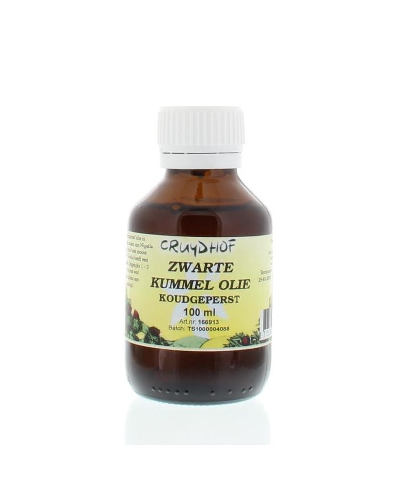 Cruydhof Zwarte kummel olie is koudgeperst vette olie uit de zaden van Nigella sativa. Dit is een kruid met mooie blauwe bloemen. De olie heeft een aromatische smaak.
