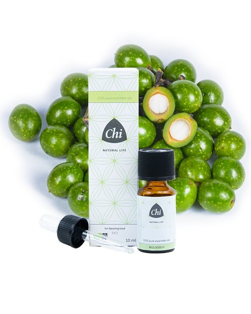 Litsea cubeba fruit oil (100% BIO), bevat van nature: Citral, Limonene, Linalool, Geraniol, Citronellol.