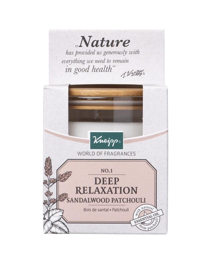 Droom weg naar verre werelden met de houtachtige geur van de Kneipp® geurkaars Deep Relaxation Sandalwood-Patchouli. Deze geurkaars met natuurlijke etherische patchouli-olie betovert de zintuigen en kalmeert de geest. Kneipp geurkaarsen kunnen de gewenste geur in een woonruimte creëren die past bij je stemming. Het deksel van deze geurkaars is gemaakt van bamboe. Na gebruik kan de kaars met de decoratieve deksel weer aromadicht worden afgesloten. De kaars heeft ongeveer 20 branduren.