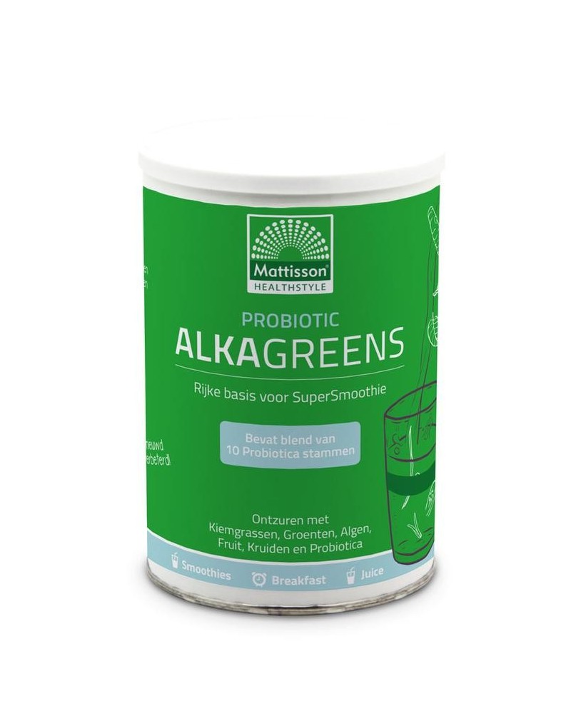 Probisson AlkaGreens poeder is samengesteld uit o.a. Kiemgrassen die Chlorofyl bevatten, Vezelrijk Groenten- en Fruit (VitaVeggieTM), hoog ORAC Bessencomplex (VitaberryTM) en Pre- en Probioticum (10 verschillende Probiotica stammen). Bevat 0,1 miljard CFU* per gram. *CFU: Colony Forming Units / kolonievormende eenheden.