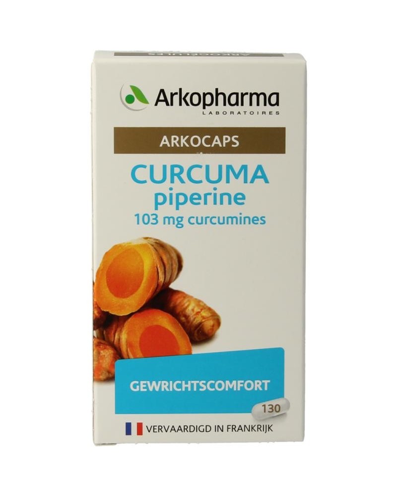 Wortelstokpoeder en -extract van Curcuma (Curcuma longa), vulstof: acaciagom, extract van zwarte peper (Piper nigrum), capsule 100% plantaardig: hydroxypropylmethylcellulose.