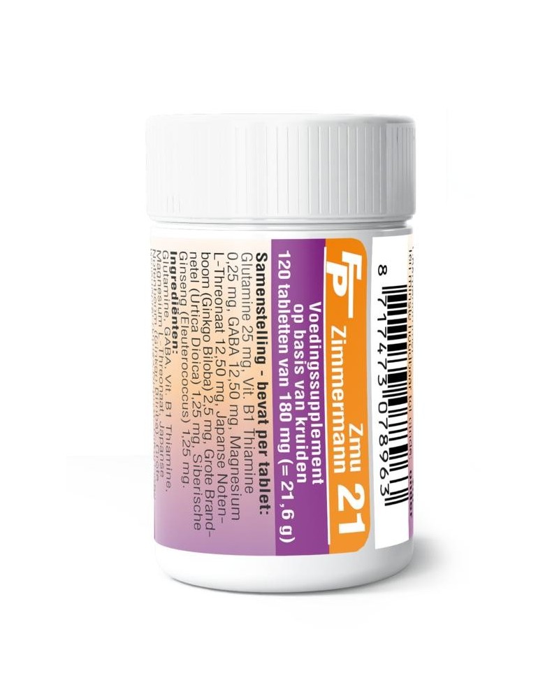 Glutamine, GABA, Vitamine B1 thiamine, L-threonine, Japanse notenboom (Ginkgo biloba), Grote brandnetel (Urtica dioica), Siberische ginseng (Eleuterococcus), Hulpstoffen: Vulstof (microkristallijne cellulose), Smaakstof (zoethoutextract), Antiklontermiddelen (stearinezuur, siliciumdioxide), Magnesiumstearaat.