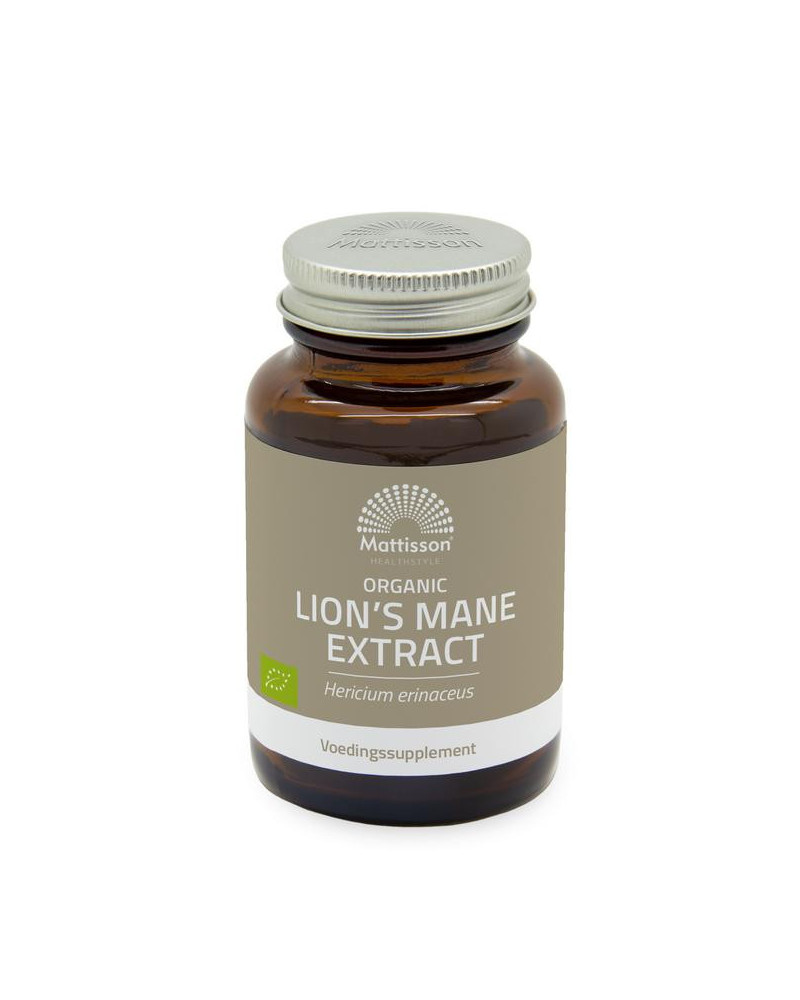 Biologisch Lion’s Mane (Pruik-zwam, Hericium erinaceus, vruchtlichaam) 10:1 heet-water extract, HPMC vegetarische capsule (huls). Bevat van nature SULFIET.