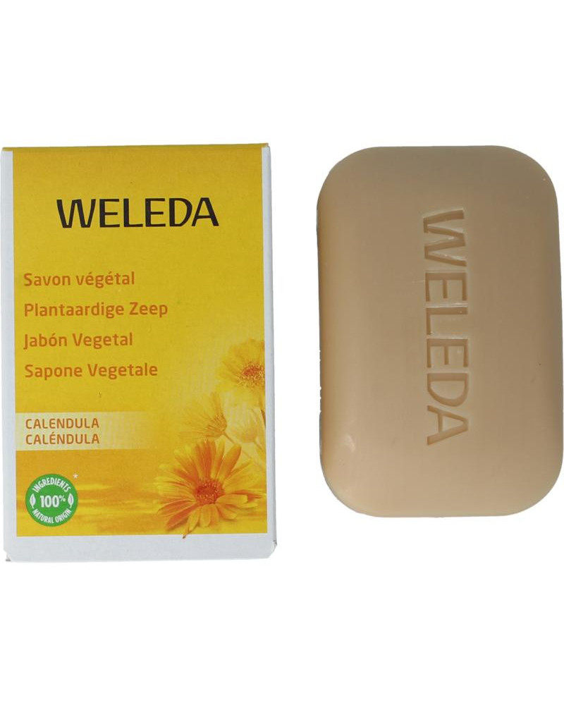 Plantaardige zeep met extracten van biologische Calendula en kamille reinigt uiterst mild en kan dagelijks worden gebruikt. Geschikt voor de gevoelige (kinder)huid. Weleda zuivere plantaardige zeep is gemaakt van zorgvuldig geselecteerde 100% natuurlijke ingrediënten, biologische plantenoliën (zoals kokosolie en olijfolie) en pure etherische oliën.