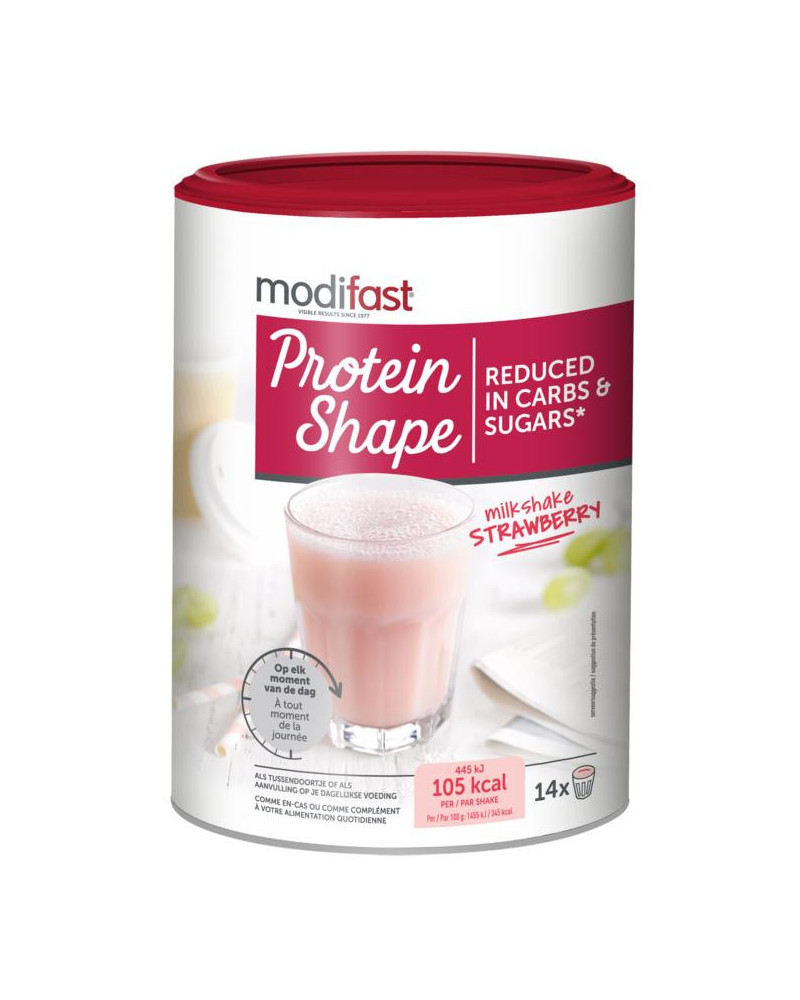 De Protein Shape Milkshake Strawberry is een verantwoorde en fruitige shake met aardbeiensmaak die zo klaar is. De milkshake is te gebruiken in het Modifast Protein Shape programma, maar hij is ook ideaal als onderdeel van een koolhydraatarm dieet. De milkshake is ook lekker als tussendoortje na het sporten.