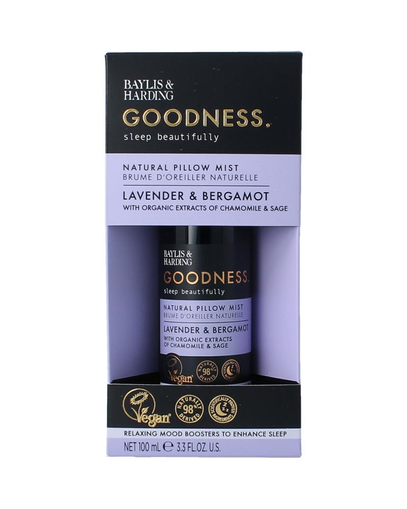 Baylis & Harding Goodness Sleep Pillow Mist Lavender & Bergamot is een fijne mist om op het hoofdkussen te sprayen. De geur bevat natuurlijke essentiële oliën van eucalyptus, zoete sinaasappel en vetiver, geaccentueerd met noten van lavendel en bergamot. Deze unieke mix van geuren helpt om lichaam en geest te ontspannen en stimuleert een goede nachtrust.