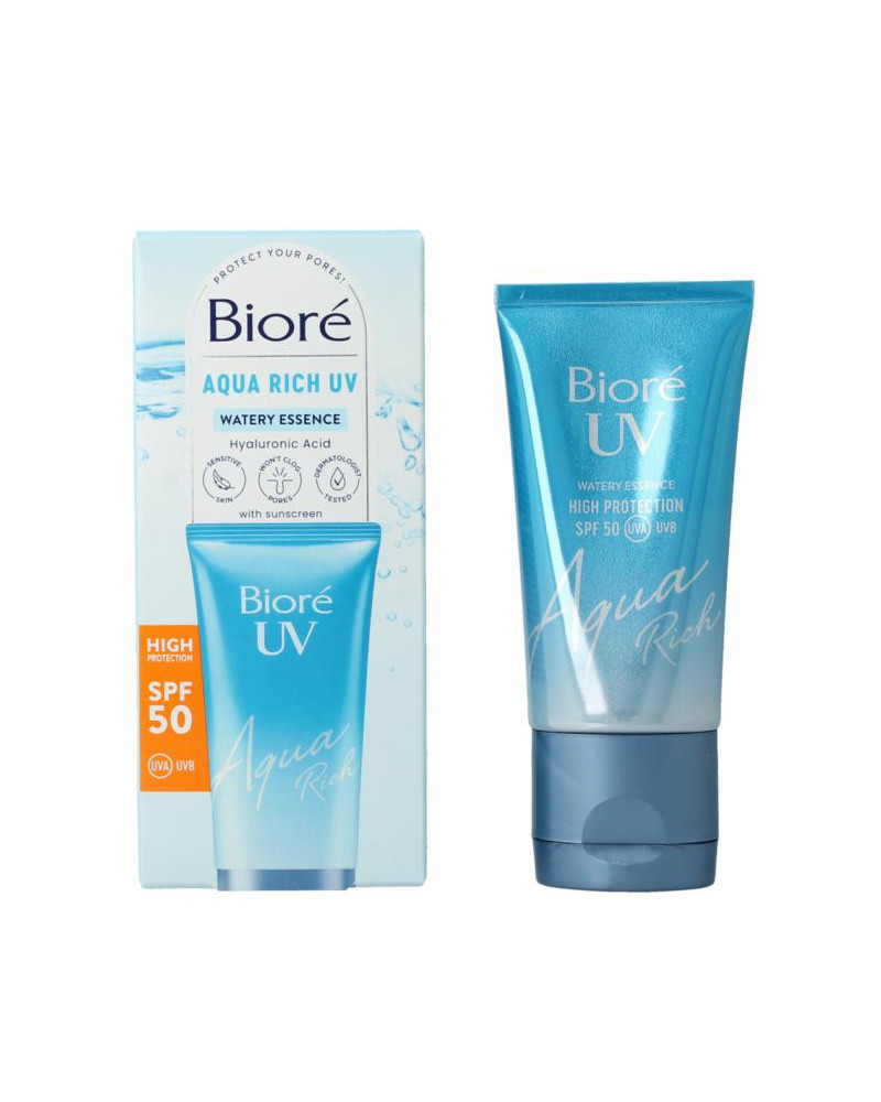 BIORÉ AQUA RICH UV is ontwikkeld op basis van Japanse Bioré Aqua Essence zonnebrand, die bekend staan om hun frisse textuur en onzichtbare, zuivere bescherming. Met SPF 50 UVA & UVB verspreidt deze gewichtloze water essence met zonnefilter zich gemakkelijk en absorbeert onmiddellijk om je huid te hydrateren en beschermen tegen UV-stralen