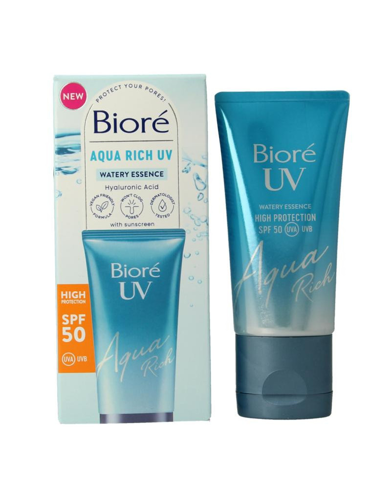 BIORÉ AQUA RICH UV is ontwikkeld op basis van Japanse Bioré Aqua Essence zonnebrand, die bekend staan om hun frisse textuur en onzichtbare, zuivere bescherming. Met SPF 50 UVA & UVB verspreidt deze gewichtloze water essence met zonnefilter zich gemakkelijk en absorbeert onmiddellijk om je huid te hydrateren en beschermen tegen UV-stralen