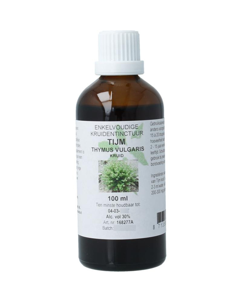 Enkelvoudige kruidentinctuur gemaakt met 100 gram gedroogd kruid van Thymus vulgaris / Tijm.