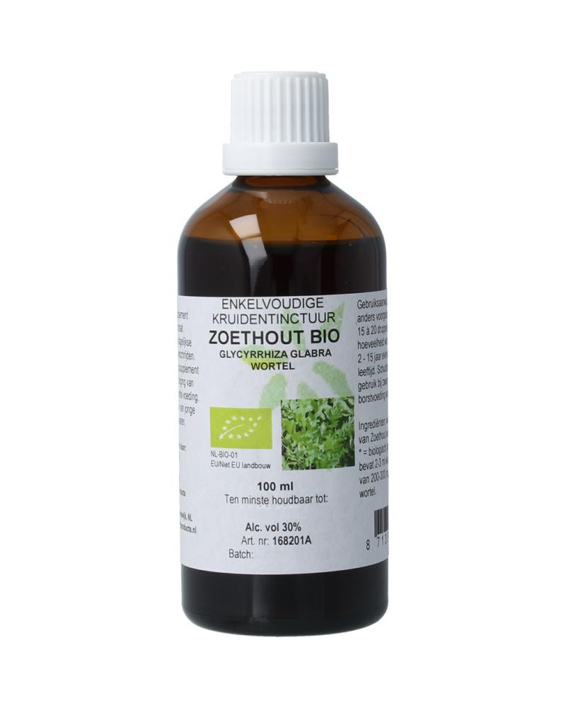 Enkelvoudige kruidentinctuur gemaakt met 100 gram gedroogd wortels van Glycyrrhiza glabra / Zoethout.