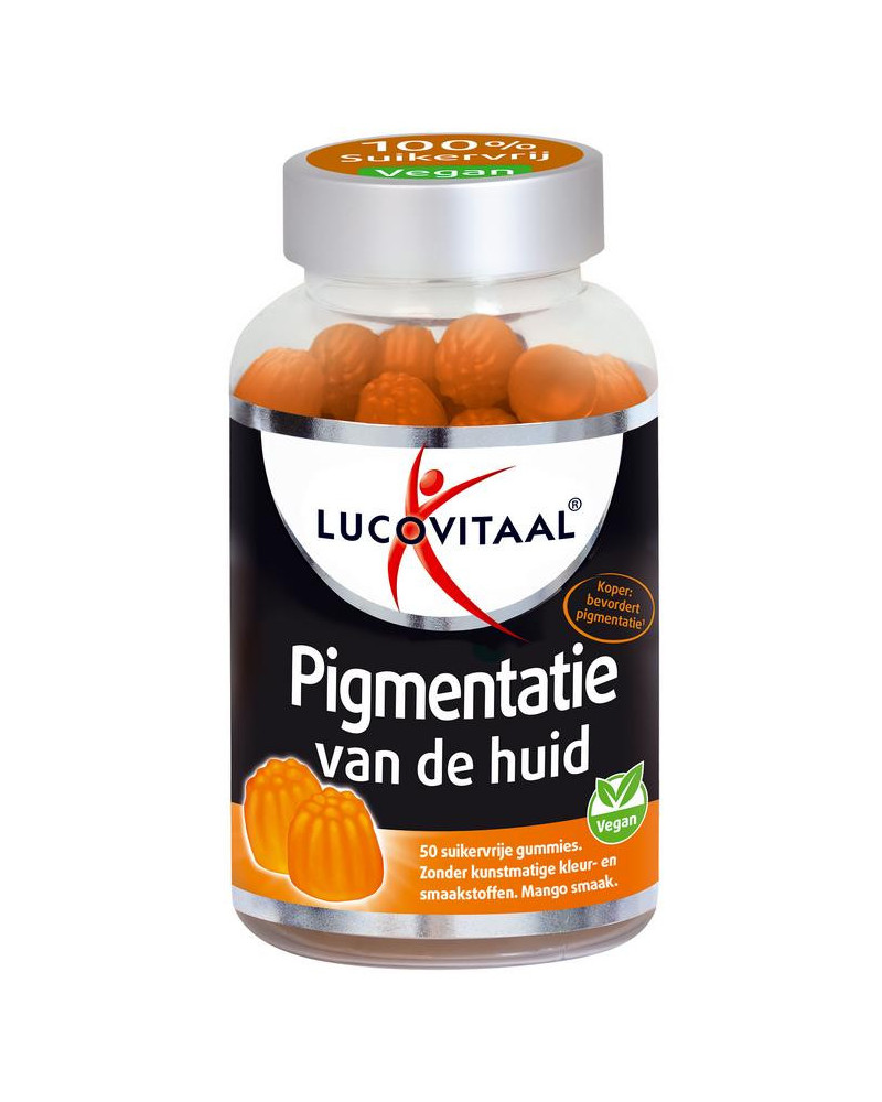 Lucovitaal Pigmentatie van de huid gummies. Zonder kunstmatige kleur- en smaakstoffen. Mango smaak.