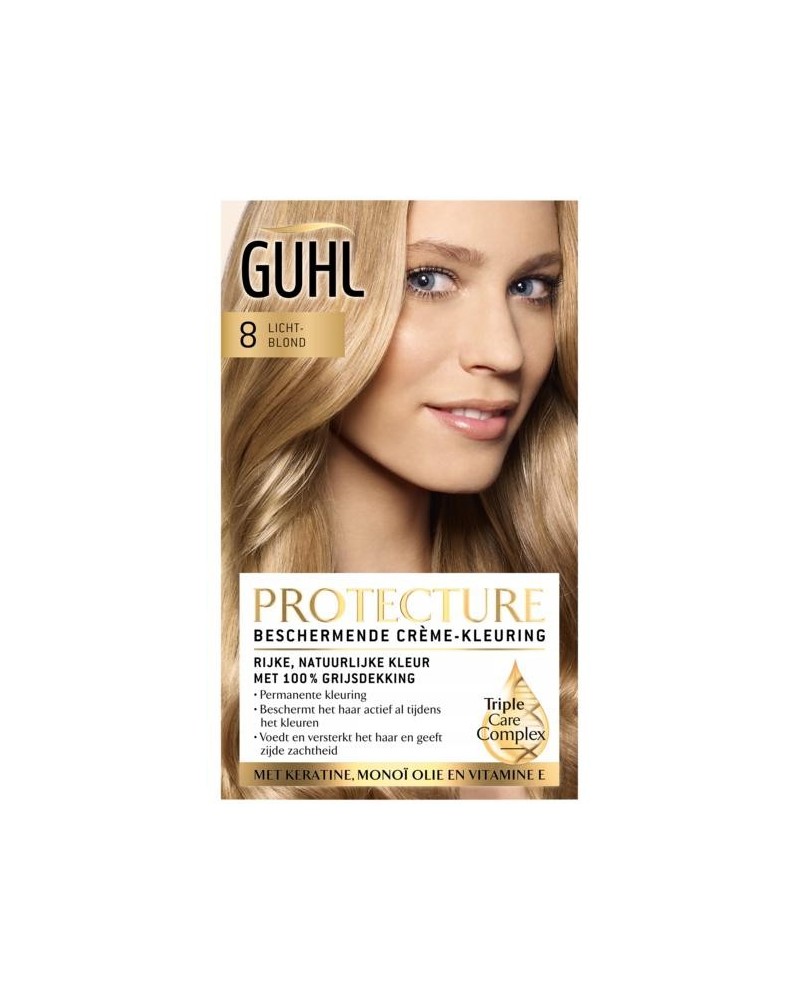 Guhl Protecture Beschermende Crème-Kleuring N8 Lichtblond, geschikt voor zeer lichtblond tot donkerblond haar, geeft uw haar een rijk, natuurlijk kleurresultaat. Het beschermt het haar al actief tijdens de kleuring. Het haar ziet en voelt gevoed en zijdezacht. Het resultaat: Rijke, natuurlijke kleur met 100% grijsdekking.