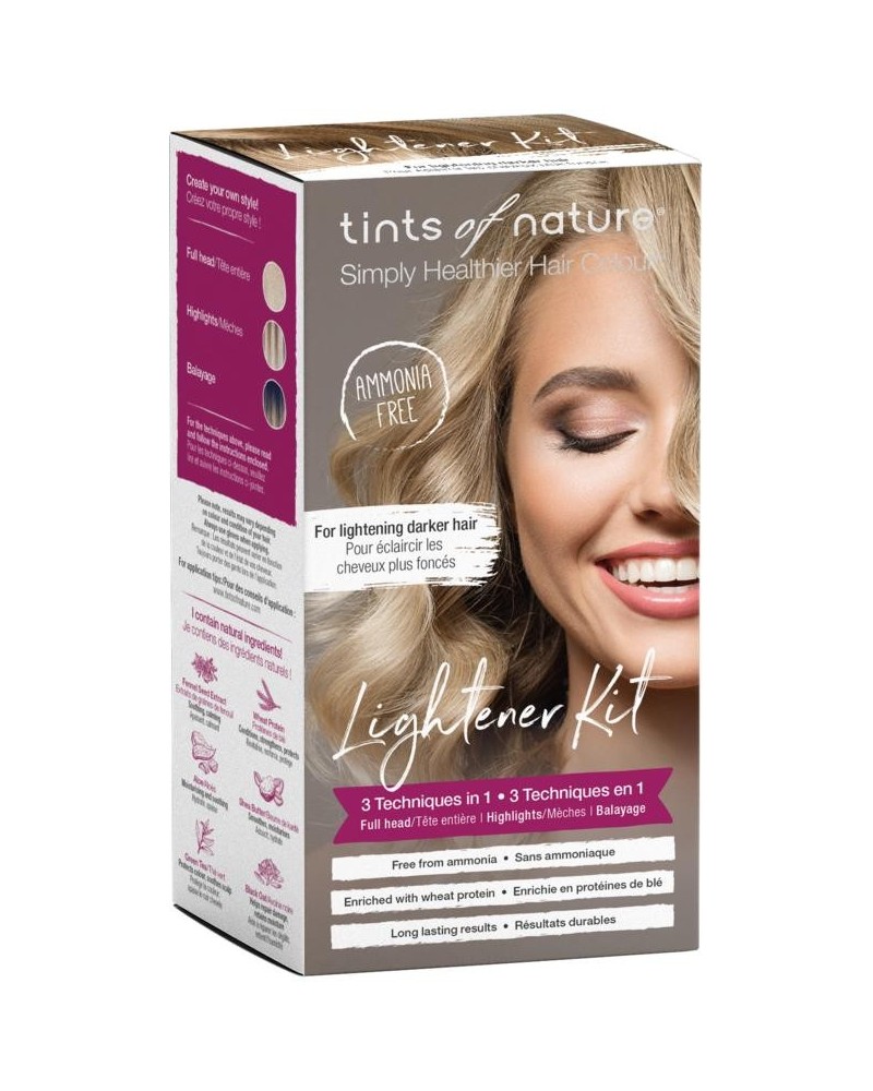 Tints of Nature allereerste ammonia-vrije Lightener Kit is vernieuwd! Hadden we eerst nog 2 aparte producten om je haar te kunnen blonderen of te voorzien van Highlights; nu hebben we met de nieuwe verpakking een handige 3 in 1 gecreëerd. Met de nieuwe salon geformuleerde Lightener Kit van Tints of Nature kun je zowel je haar 4 tot 7 tinten blonderen, leuke, speelse blonde highlights (vergelijkbaar met het aanbrengen van folies vanaf de hoofdhuid) aanbrengen maar ook een balayage techniek (aanbrengen van kwastvegen waarbij de aanzet donker blijft) toepassen. Ontwikkeld met een natuurlijk oliemengsel om de hoofdhuid en haar te beschermen en te conditioneren gedurende het blondeer proces. U kiest het effect en wij zorgen voor de conditie en verzorgen uw haar zacht, zijde-achtig met een diepe, langdurige glans en een geweldige nieuwe look!met een diepe, langdurige glans en een geweldige nieuwe look!
