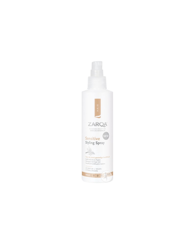 Zarqa Sensitive Styling Spray geeft volume en fixatie aan het haar. Het haar valt natuurlijk en soepel in model, zonder dat het zwaar wordt. Deze haarspray geeft glans en zorgt voor sterker aanvoelend haar. Bevat actieve ingrediënten die de talgproductie reguleren. Deze haarspray bevat geen parfum of alcohol en is geschikt voor de meest gevoelige hoofdhuid en ieder haartype.