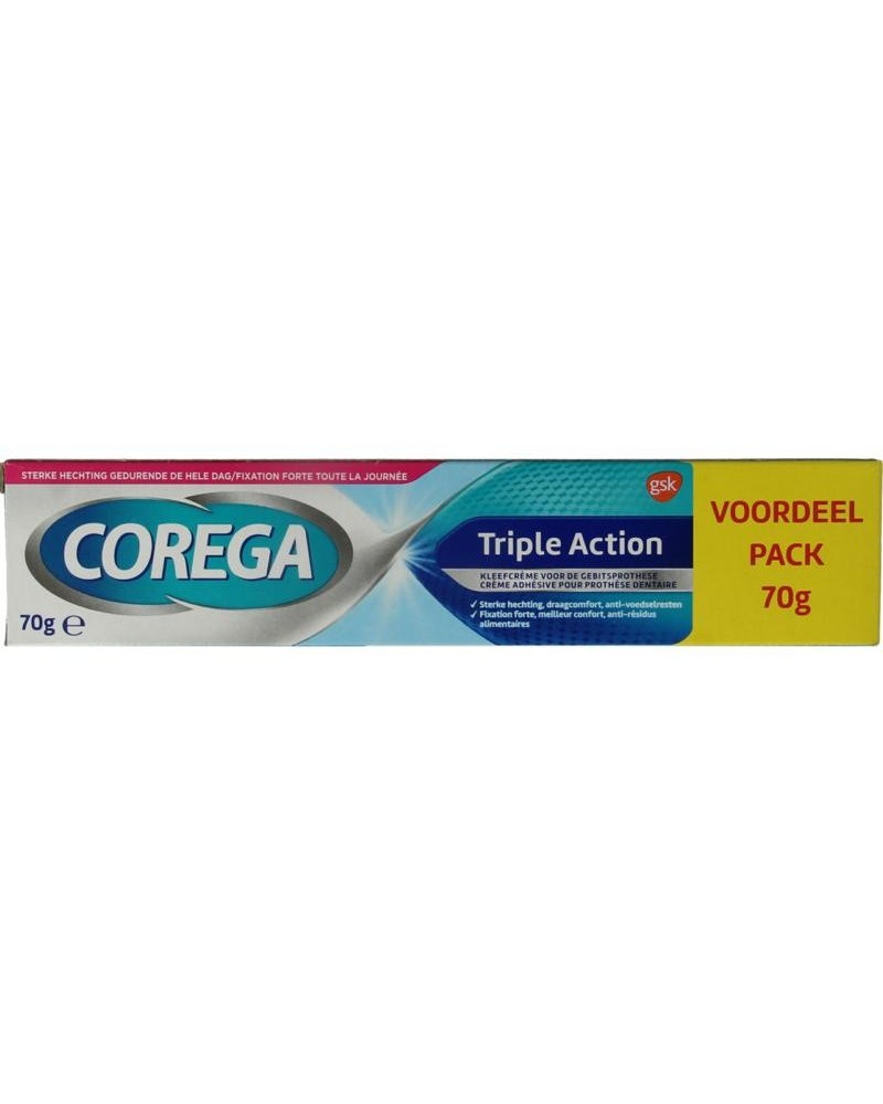 Corega Triple Action kleefcrème voor gebitsprotheses geeft de hele dag een stevige houvast voor een comfortabele fixatie die voedselresten helpt buiten te houden. Corega Triple Action is geformuleerd om 12 uur mee te gaan en bevat geen zink.