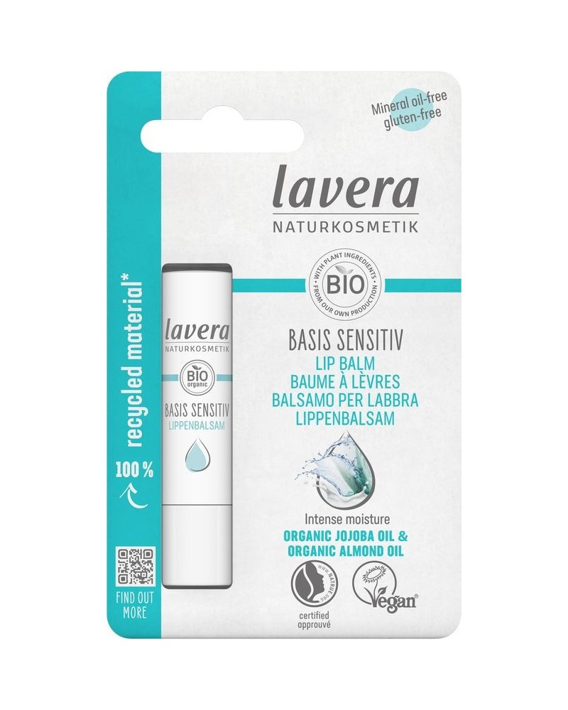 basis sensitiv Lippenbalsem van lavera met biologische jojoba-olie en biologische amandelolie verzorgt zachtjes droge en gevoelige lippen. Deze zijdezachte lippenbalsem creëert een langdurige natuurlijke beschermfilm op de lippen, beschermt ze tegen uitdroging en zorgt ervoor dat ze zacht en soepel aanvoelen. De veganistische formule is bovendien vrij van minerale oliën en gluten.