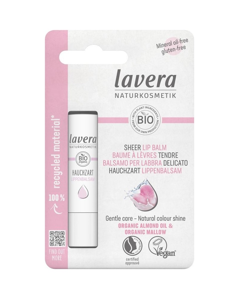Sheer Lip Balm van lavera met biologische amandelolie en biologische kaasjeskruid voedt de lippen op een zachte manier en voegt een vleugje natuurlijk roze toe. Deze lippenbalsem creëert een langdurige film op de lippen, beschermt ze tegen uitdrogen en maakt ze zacht en soepel. De veganistische formule is bovendien vrij van minerale oliën en gluten.