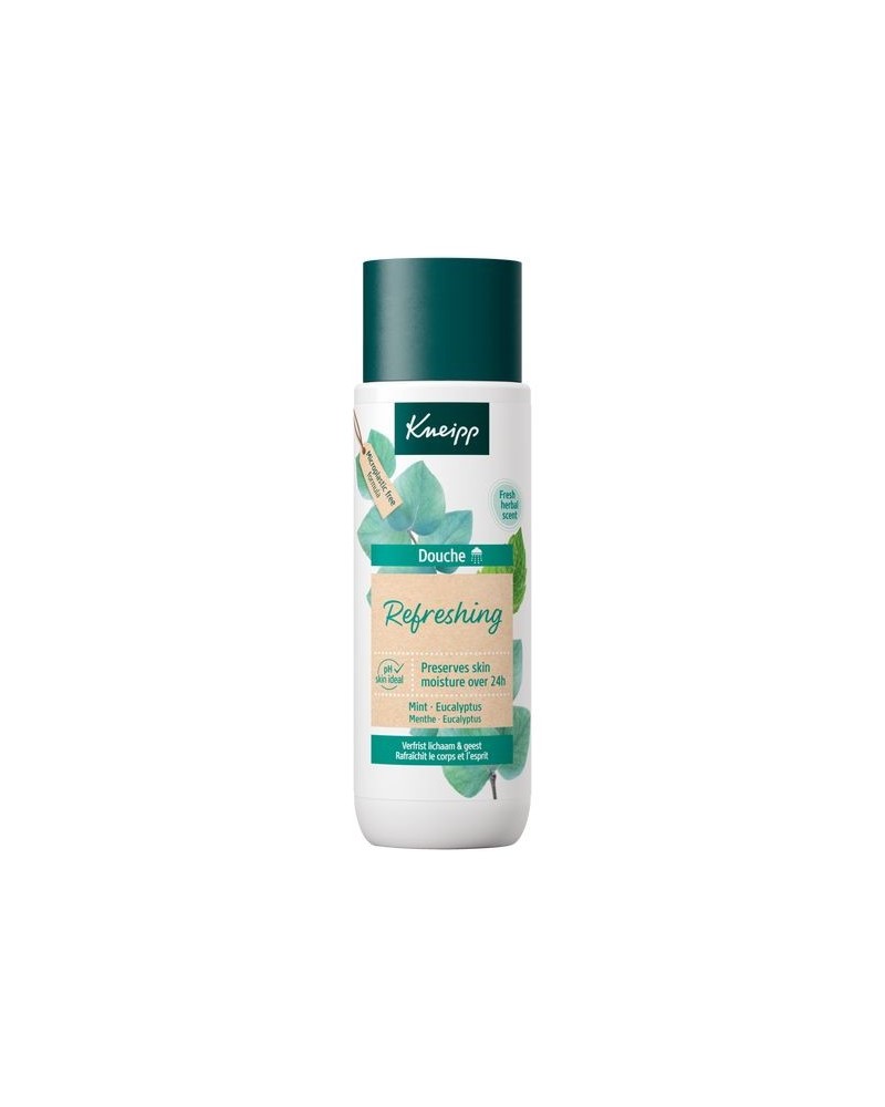 Jouw Kneipp®-moment voor verfrissing. De douchegel Refreshing bevat natuurlijke etherische mint- en eucalyptusolie, is mild reinigend en zeepvrij. Geniet van de frisse geur en het zachte schuim. De waardevolle productformulering respecteert en behoudt het huideigen microbioom en laat de huid zacht en soepel aanvoelen. Het vochtgehalte van de huid blijft behouden. – bevestigd door wetenschappelijk onderzoek.