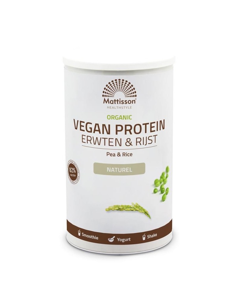 Deze Biologische Vegan Protein Erwt & Rijst is een mix van gefermenteerde erwten en bruine gekiemde rijst proteïne. De combinatie van erwten en rijst proteïne zorgt ervoor dat er een optimaal compleet aminozuur profiel ontstaat dat bijna gelijkwaardig is aan een wei isolaat. Dit maakt het een ideaal vegan alternatief voor wei proteïne. Per portie van 30 gram bevat dit product 24,5 gram eiwit, waarvan 4,8 gram BCAA’s.