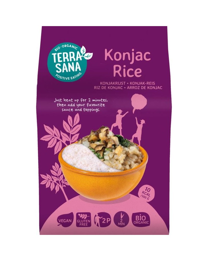 Konjac (ook wel konjak genoemd) is een plant waarvan de wortel (vezel) gebruikt wordt om ‘rijst’ te maken. Konjacrijst is dus een vervanger voor rijst, maar dan low-carb, low-calorie en glutenvrij. Ideaal als je vandaag even geen koolhydraten wilt eten, of als je al aan je calorieën zit voor vandaag. De vorm lijkt op rijst, waardoor je het gevoel hebt dat je rijst eet. De smaak en structuur is echt anders. Dat kan ook niet anders met een product dat zo erg op rijst lijkt, maar toch zo verschilt in voedingswaarde. Het grote voordeel aan de konjac rijst van TerraSana? Er zit geen vieze visgeur aan, dus je hoeft de rijst niet vooraf om te spoelen. Ready to eat, of ready to heat. Ga je de konjacrijst verwarmen, dan ben je in 2 minuten klaar. Een gemaksproduct dat alles in huis heeft!