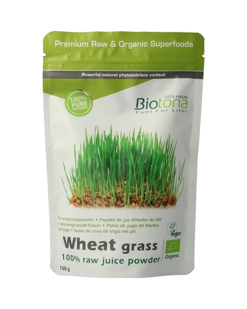 Biotona bio Tarwegras Raw is afkomstig van de jonge scheuten van tarwe, die geoogst worden net vóór de graanvorming begint. Dit is namelijk het moment waarop de aanwezige fytonutriënten hun hoogste niveau bereikt hebben. Het poeder wordt geproduceerd volgens het EverRAW proces, een subliem proces dat versheid en kwaliteit garandeert, waarbij het geperste sap in slechts 2 minuten tijd gedroogd wordt en waarbij de temperatuur altijd rond de lichaamstemperatuur blijft. Het proces van de oogst naar poeder neemt slechts 2 uur in beslag en garandeert het behoud van alle vitaminen, mineralen en enzymen uit het tarwegras. De felgroene kleur van het poeder verraadt de grote aanwezigheid van natuurlijk chlorofyl, het plantaardige hemoglobine!