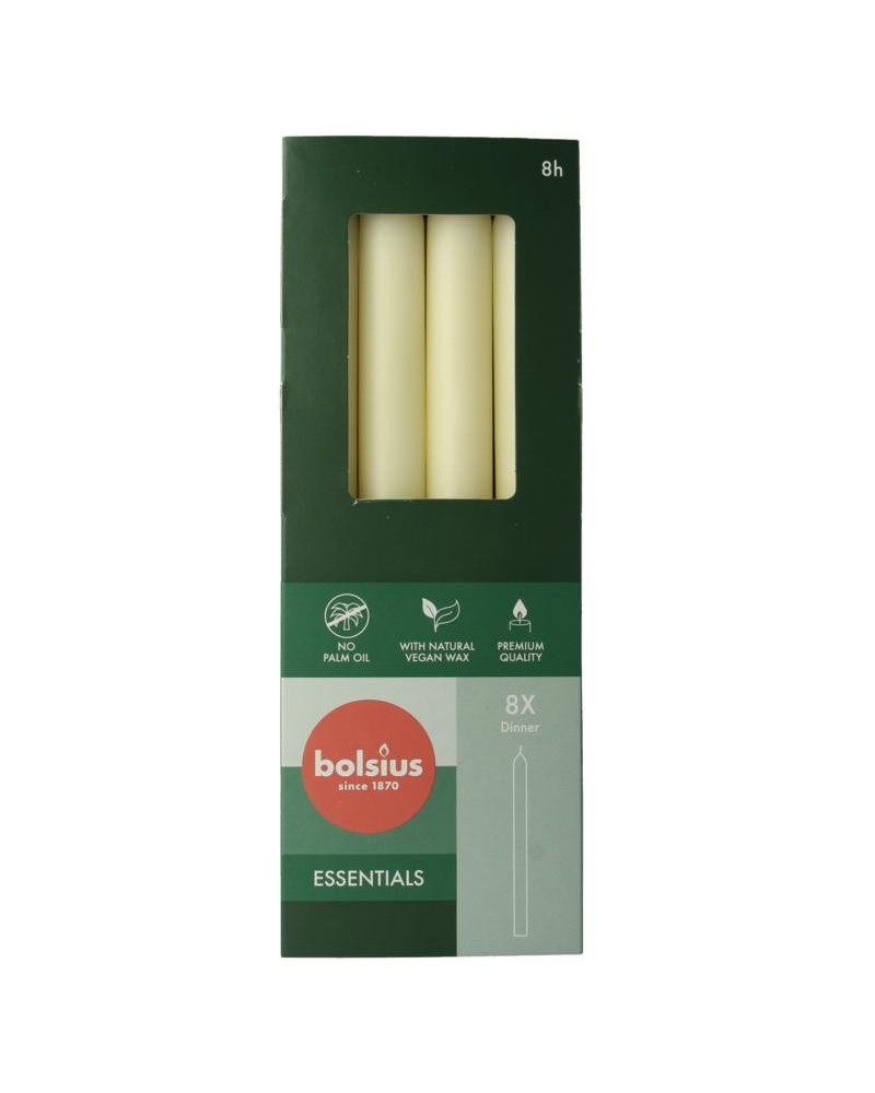 De Bolsius gladde dinerkaars in de crème ivoorkleur Soft Pearl is 23cm hoog en brandt 8 uur. Gemaakt zonder palmolie en met natuurlijke vegan wax