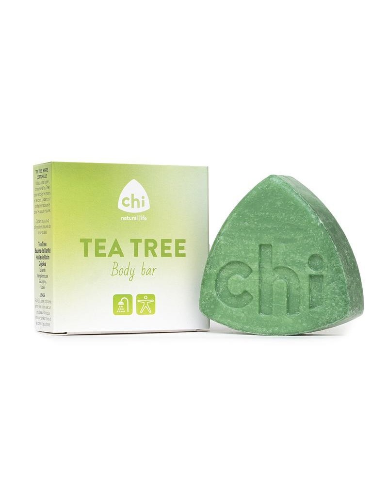Tea Tree Body Bar is ideaal voor de dagelijkse reiniging en verzorging van het lichaam. Te gebruiken onder de douche maar ook als handzeep. Tea Tree Body Bar ruikt heerlijk fris door de toevoeging van lavendel, grapefruit, eucalyptus en litsea en is zeer reinigend door de biologische tea tree olie. De basis van de Bar bestaat uit de verzorgende en voedende plantoliën van sheabutter, jojoba en castorolie. De formule ondersteunt de doorbloeding en is zuiverend bij een onreine huid. Als resultaat zorgt de bar voor een schone en zachte huid. De Chi essentiële oliën geven een heerlijke geur, die je ook na het badkamermoment nog met je meedraagt.