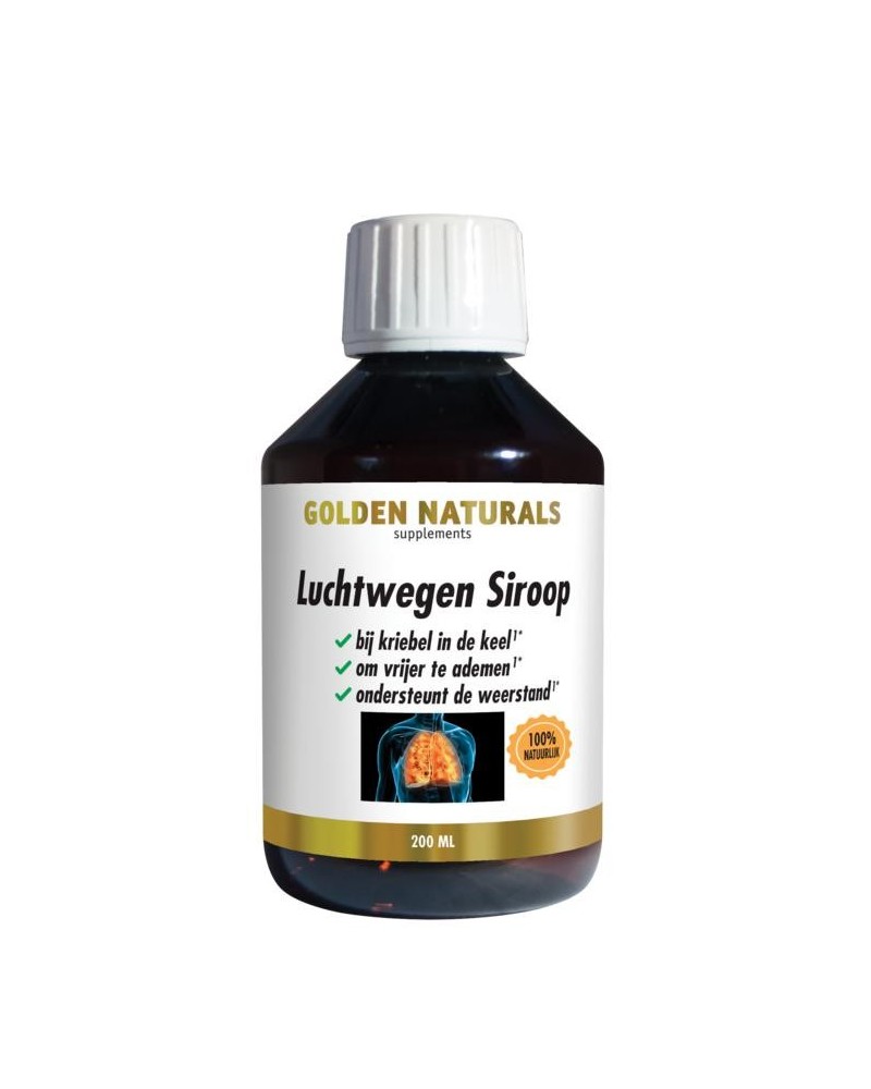 Golden Naturals Luchtwegen Siroop is een siroop met Sambucus nigra (zwarte vlierbes), honing en mirte-olie.