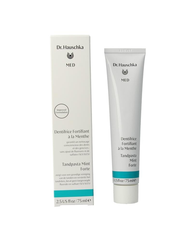 Dr. Hauschka MED Tandpasta Mint Forte zorgt voor een grondige reiniging van de tanden en versterkt het tandvlees. De samenstelling van zorgvuldig uitgekozen plantenextracten, natuurlijke etherische oliën alsook zacht reinigende minerale reinigingsdeeltjes maakt de tanden grondig schoon en ondersteunt de mondhygiëne. Tandpasta Mint Forte bevat geen toegevoegde fluoride en sulfaat (SLS/SLES).
