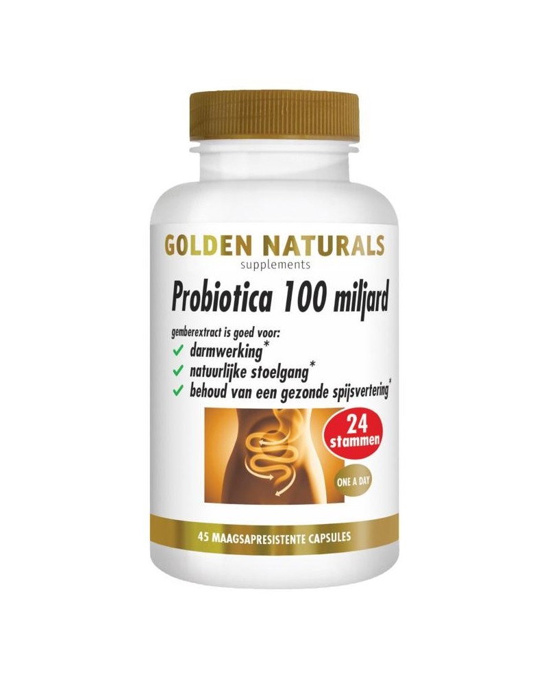 Probiotica 100 miljard met 24 stammen. Probiotica zijn gunstige bacteriën die van nature in ons spijsverteringsstelsel (mond, maag, darmen) voorkomen. Daar helpen ze ons lichaam bij het verteren van voedsel. Probiotica komt uit het Grieks en betekent vrij vertaald ‘voor het leven’. De probioticaproducten van Golden Naturals zijn samengesteld uit meerdere stammen van de belangrijkste soorten micro-organismen. Daarmee voorzien ze in een dagelijkse portie goede bacteriën. Daarnaast is prebioticum (inuline) toegevoegd. Prebiotica worden afgebroken door de bacteriën in de dikke darm, dit proces heet fermentatie. In feite dienen prebiotica als voedsel voor die bacteriën.