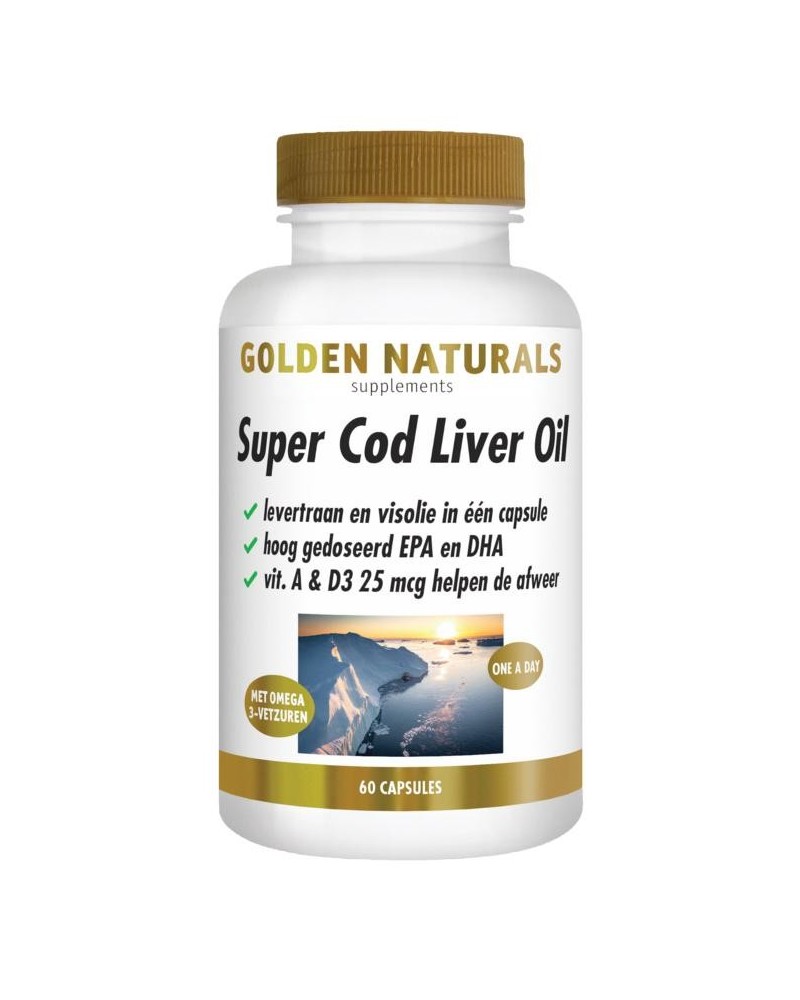 Golden Naturals Super Cod Liver Oil levertraan en visolie in één capsule levert omega 3-vetzuren; hoog gedoseerd EPA en DHA. Met vitamine A en vitamine D3 25 mcg.