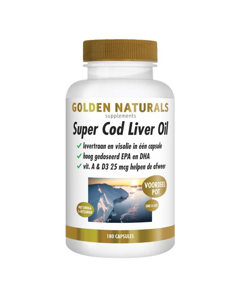 Golden Naturals Super Cod Liver Oil levertraan en visolie in één capsule levert omega 3-vetzuren; hoog gedoseerd EPA en DHA. Met vitamine A en vitamine D3 25 mcg.