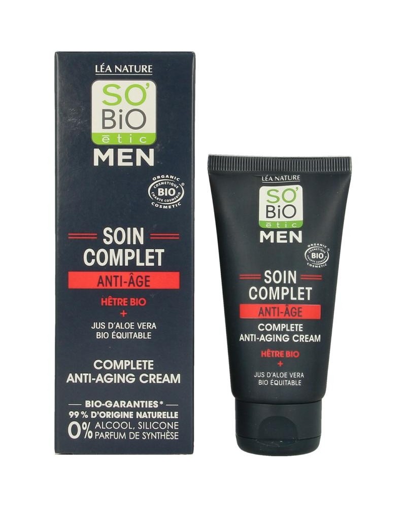 SO'BiO étic FOR MEN biedt een complete range verzorgingsproducten voor mannen. Deze anti aging dagcrème biedt een volledige anti-aging bescherming dankzij biologisch gewonnen beuk die effectief huidveroudering tegengaat en biologisch en fairtrade aloë vera die de huid gedurende 24 uur hydrateert. Kalmeert de huid na het scheren. De formule verstevigt en vertraagt de vorming van fijne lijntjes. Het subtiele en natuurlijke parfum van deze stoere mannenlijn heeft frisse topnoten van citrus, fruitige en aquatische hartnoten en mannelijke basisnoten dankzij labdanum, hout en den. Effectief en pure verwennerij voor hem! Geschikt voor alle huidcondities. SO'BiO étic anti-aging cream For Men is vegan, vrij van parabenen, siliconen, microplastics, pfas en 99% natuurlijk van samenstelling. Dermatologisch getest en Cosmebio/Ecocert Cosmos Organic gecertificeerd.