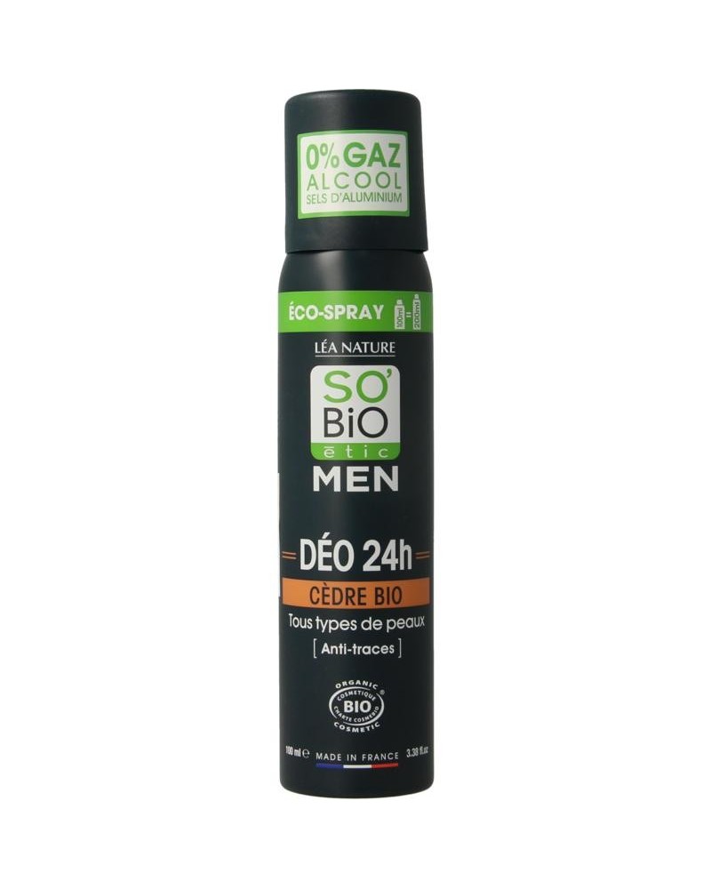 De SO'BiO étic 24h deodorant spray voor mannen garandeert natuurlijke frisheid gedurende de hele dag. Deze eco-spray bevat geen aerosolen of alcohol. Als lid van 1% for the planet draagt SO'BiO étic al extra bij aan een duurzamer planeet maar met deze samengeperste formule gaat deze deo spray twee keer zo lang mee als een gewone deodorant en vormt daardoor een extra duurzame vorm van persoonlijke verzorging voor de man anno nu. Deze deodorant spray heeft een heerlijke houtachtige geur dankzij de biologisch en fairtrade cederhout. Deze natuurlijke deodorant is effectief werkzaam zonder het proces van natuurlijke transparantie in de weg te staan. Het resultaat is een langdurig fris gevoel zonder witte strepen. De formule is aluminium-vrij en bevat geen parabenen, microplastics, aerosolen en/of alcohol. Deze 24h deodorant spray Cedar for MEN is vegan en 99% natuurlijk van samenstelling en Cosmebio/ Ecocert Cosmos Organic gecertificeerd.