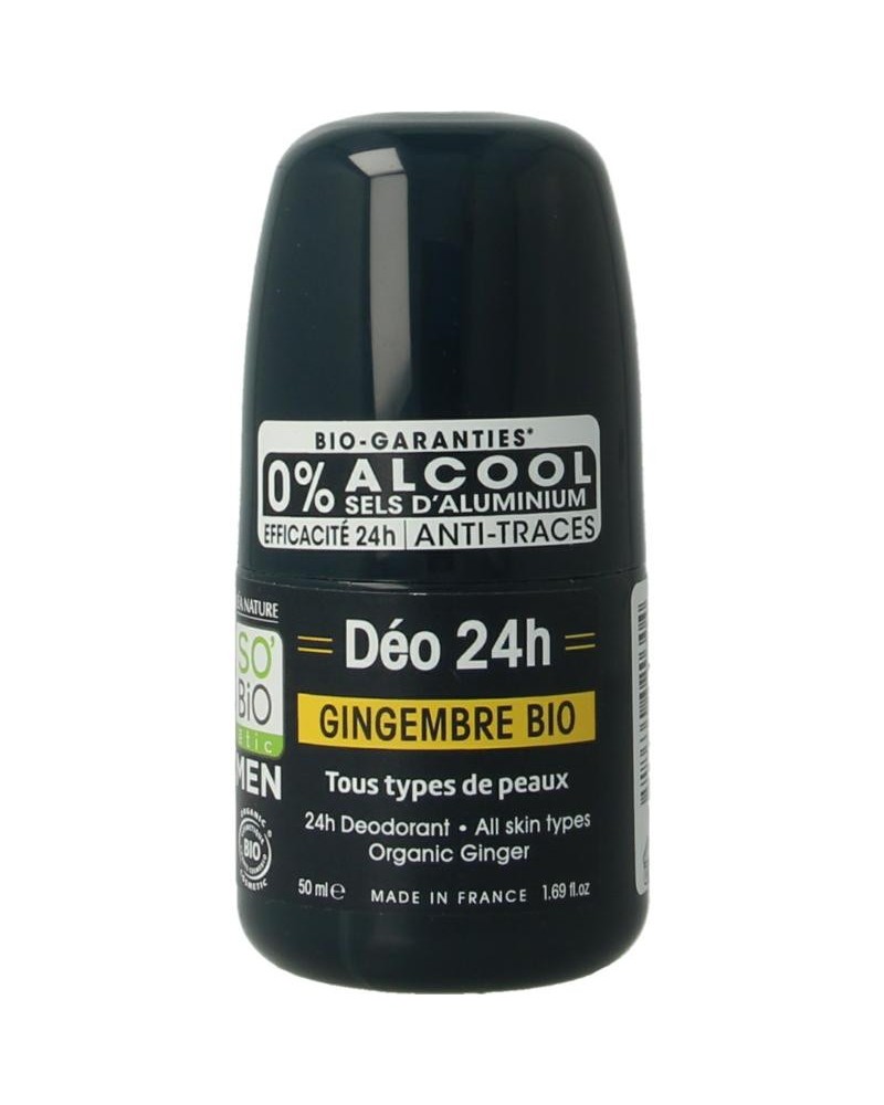 De SO'BiO étic 24h deodorant voor mannen garandeert natuurlijke frisheid gedurende de hele dag. Door de toevoeging van natuurlijke absorberende poeders is deze Cosmebio/Ecocert gecertificeerde deodorant effectief werkzaam zonder daarbij het proces van natuurlijke transparantie in de weg te staan. Het resultaat is een langdurig fris gevoel zonder witte strepen. De formule is aluminium-vrij en bevat geen parabenen en/of alcohol. Deze 24h deodorant Ginger (gember) for MEN is vegan van samenstelling en heeft zijn houtachtige geur te danken aan de toevoeging van biologische gember.